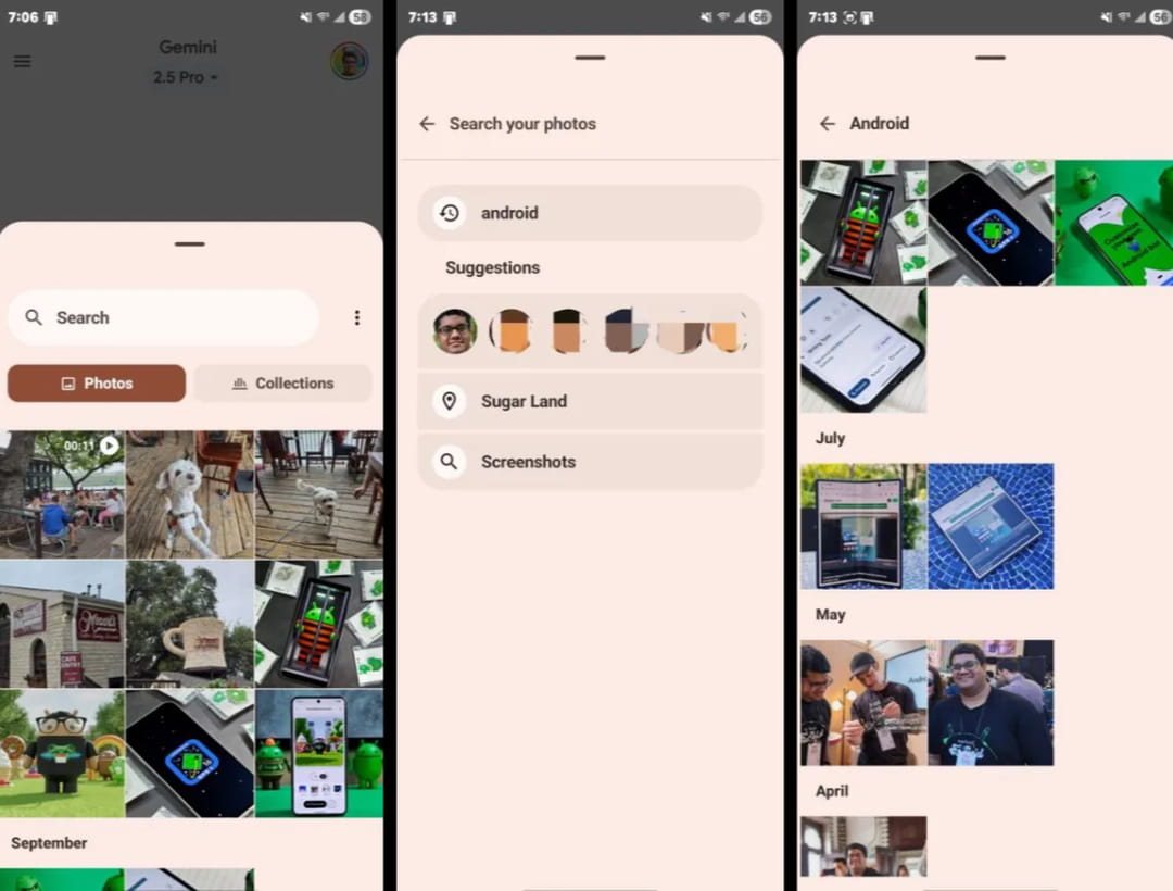 Lorsque Google a lancé la mise à jour du système Google Play d'août 2025, le chercheur a constaté l'activation d'une barre de recherche, qui apparait en haut du sélecteur de photos. Elle permet de saisir des mots-clés pour trouver des images, des GIF ou des vidéos spécifiques dans la galerie locale. Pour ceux qui auraient autorisé le sélecteur de photos à accéder à leur photothèque Google Photos, il affiche également des recommandations de recherche de personnes et de lieux et récupère des correspondances depuis la photothèque en ligne. Cette fonction permet notamment de filtrer les résultats par visages, lieux ou encore mots-clés, ce qui facilite la sélection des images souhaitées.