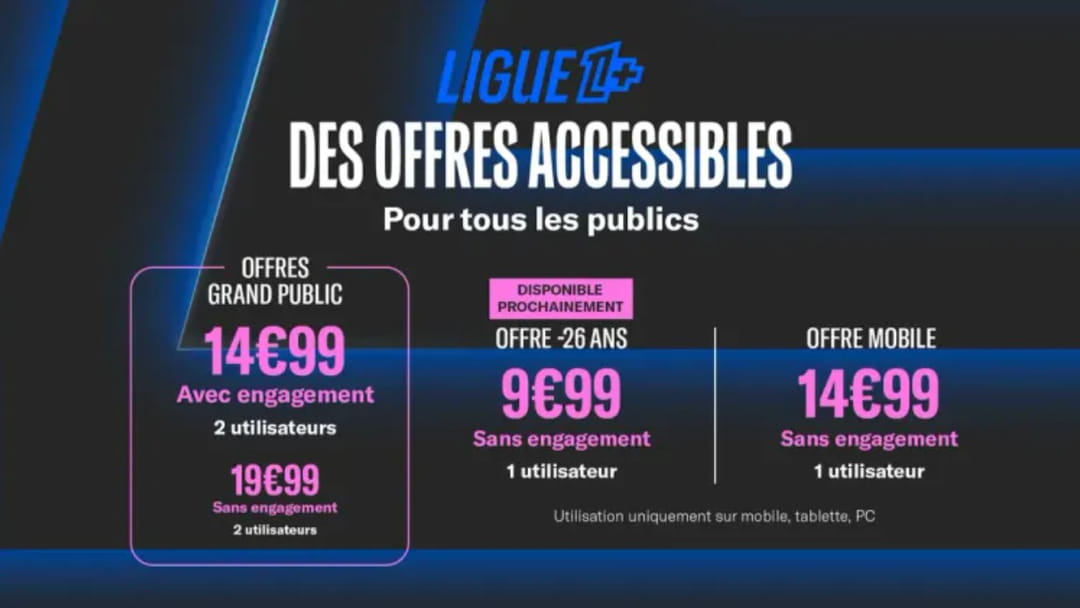 Ligue 1+ proposera les huit matches en direct en exclusivité chaque journée du vendredi au dimanche – les droits du neuvième match sont encore détenus par beIn Sports –, accompagnés de deux magazines hebdomadaires, le samedi et le dimanche soir. Et, cette fois, les tarifs sont beaucoup plus raisonnables que ceux de DAZN à son lancement, d'autant plus que les abonnés ont la possibilité de partager leur compte pour faire baisser la facture, et ce, avec la bénédiction de la LFP !