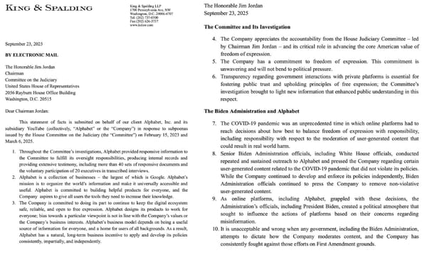 Et, visiblement, le dîner d’État qui a rassemblé Mark Zuckerberg, Jeff Bezos, Bill Gates, Sam Altman, Tim Cook ou encore Sundar Pichai début septembre s'est bien passé ! Google a décidé de faire une nouvelle marque d'allégeance en envoyant à la Chambre des représentants une lettre, et pas des moindres ! L'entreprise y annonce mettre fin à une grande partie de sa politique contre la désinformation sur YouTube, notamment en rétablissant les nombreuses chaînes qu'elle avait bannies en raison de propos complotistes sur la Covid-19 et sur les élections américaines. Un tournant pour la plateforme, qui réaffirme "l'engagement de la société en faveur de la liberté d'expression".