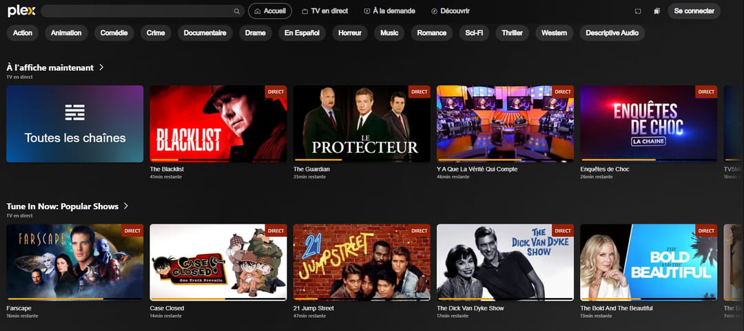 Il suffit de cliquer sur le bouton "Regarder gratuitement" pour que le lecteur s'affiche et démarre la lecture du film, après une courte publicité. Il n'y a même pas besoin de se créer de compte ou de se connecter de quelque manière que ce soit, même si c'est évidemment possible pour ceux qui le souhaitent ! Et pour compléter cette ̂partie vidéo-club, Plex.tv propose même un service de télévision en direct. Une plate-forme très complète, à découvrir d'urgence !