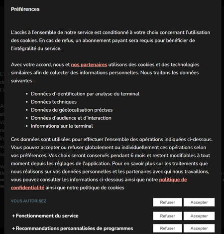 ► Il ne vous reste ensuite plus qu'à créer votre premier profil de visionnage puis d'accepter les diverses conditions proposées par l'opérateur en termes d'utilisations des données. À noter que vous êtes obligé de tout accepter, sinon il vous sera proposé de basculer sur l'offre payante. Bon visionnage !