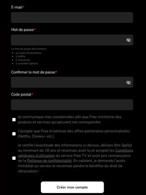 ► Remplissez les différents champs de saisie et cochez les conditions d'utilisation, puis cliquez sur le bouton blanc Créer mon compte. Pensez à valider votre adresse électronique depuis votre boîte mail ;