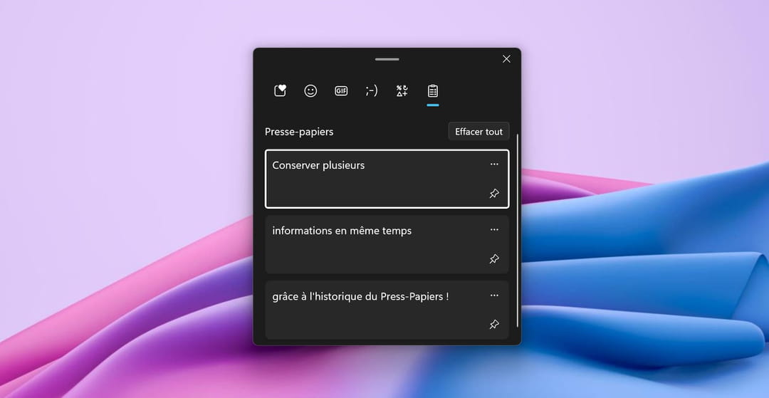 Pour faire apparaître cet outil magique, utilisez simplement le raccourci-clavier Windows + V (appuyez simultanément sur la touche du logo Windows et la lettre V du clavier). Dans la fenêtre qui apparaît, vous retrouverez alors toutes les données textuelles que vous avez précédemment copier. Si le curseur de votre souris est positionné dans un document ou un champ pouvant recevoir du texte, vous pouvez alors insérer n'importe quelle donnée de l'historique en cliquant simplement dessus dans la liste. Il est également possible d'épingler les données dont vous vous servez le plus souvent en haut de la lister, afin de les retrouver et les coller plus rapidement. Et bien sûr, vous pouvez effacer l'historique de votre Presse-papiers via le bouton Effacer tout, pour ne pas laisser traîner des informations confidentielles une fois que vous n'en avez plus besoin !