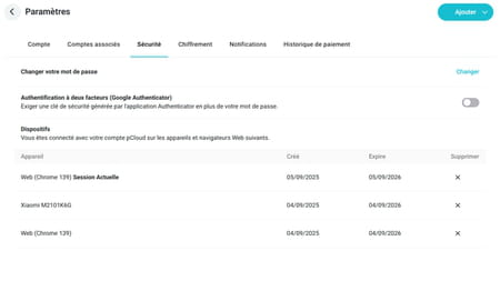 Enfin, l'utilisateur peut consulter la liste de ses appareils connectés et révoquer une session à distance en cas de besoin. Côté infrastructure, pCloud met en avant sa base en Suisse et l'hébergement de ses serveurs en Europe et aux États-Unis, dans le respect des standards de confidentialité en vigueur.