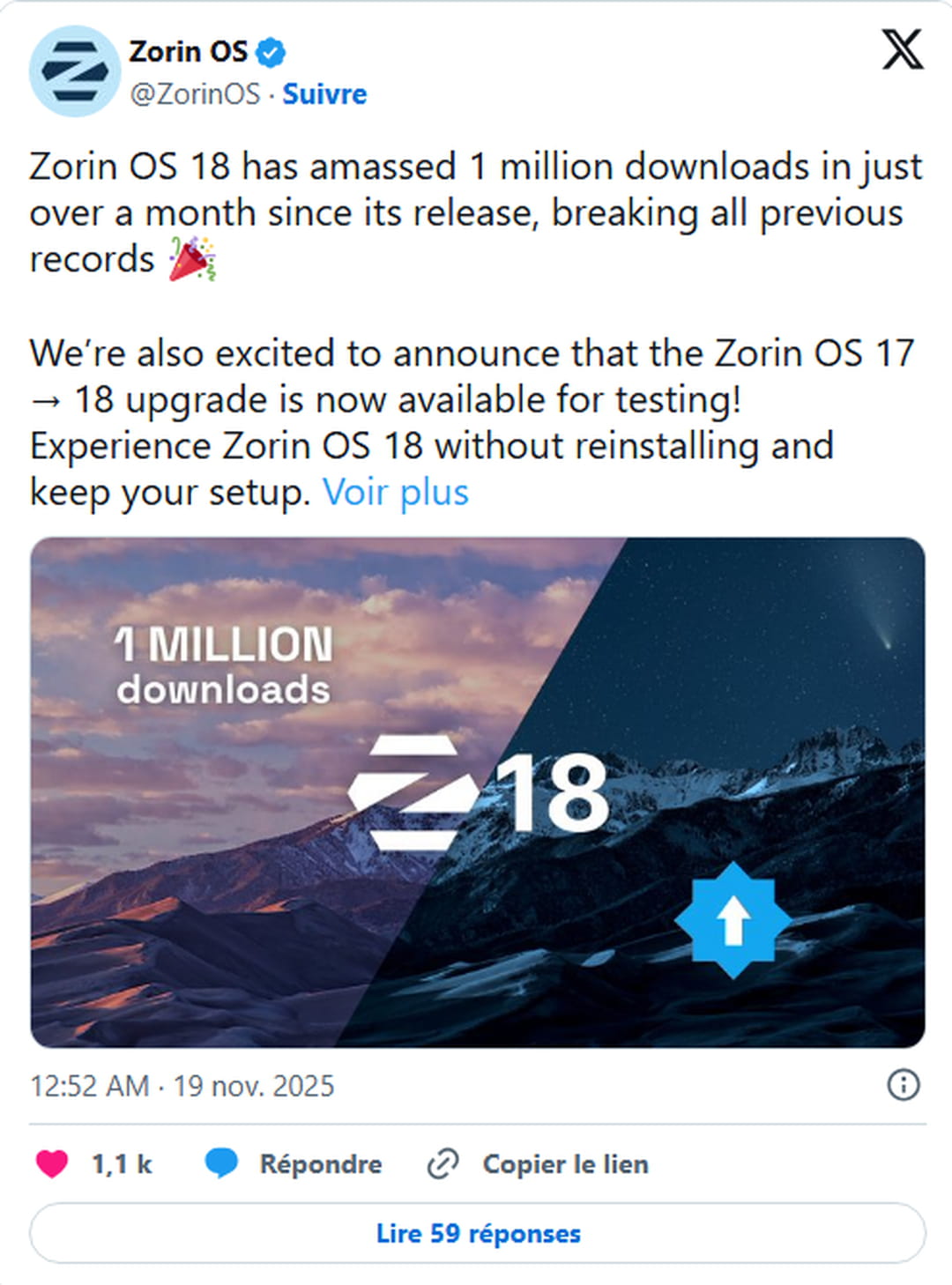 À mesure que Windows 10 s'efface, une autre histoire se dessine. Depuis la mi-octobre, Zorin OS attire un nombre inattendu d'utilisateurs qui refusent de basculer vers Windows 11. Basée sur Ubuntu, cette distribution Linux gratuite a atteint le million de téléchargements en un peu plus de cinq semaines, un volume rarement observé dans l'écosystème Linux.