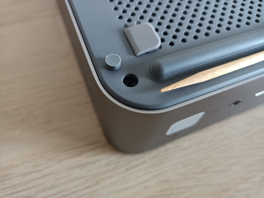 Comme indiqué en introduction, tous les modèles de la famille GTi Ultra sont extensibles en matière de mémoire vive et de stockage interne. La RAM n'est pas soudée et les SSD ne sont pas collés, ce qui garantit effectivement une certaine évolutivité. Cependant, les choses ne sont pas si simples, car la manipulation pour accéder aux composants internes est relativement ardue, et découragera certainement les moins patients et les moins bricoleurs. La première difficulté consiste à retirer les petits caches en caoutchouc qui protège les visses de la plaque inférieure, ce qui nécessitera obligatoirement d'utiliser un objet fin et rigide, comme une aiguille de couture (ou une pique à brochette dans notre cas).