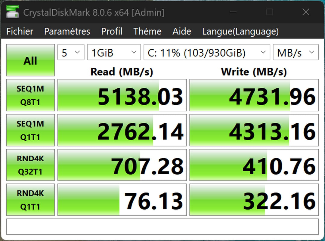 Dernier point avant de clore cette section sur les performances du GTi13 Ultra, avec un détour par CrystalDiskMark pour évaluer la vélocité du SSD. En la matière, les résultats sont bons sans être exceptionnels, avec une lecture séquentielle à 5,1 Go/s et une écriture séquentielle à 4,7 Go/s. C'est dans la bonne moyenne des PC actuels et suffisant pour la plupart des usages, dont le jeu vidéo. Les charges de travail sollicitant fortement le stockage, avec des échanges volumineux et fréquent entre la RAM et le SSD seront peut-être à la peine, mais la plupart des tâches courantes, créatives et ludiques s'effectueront sans problème.