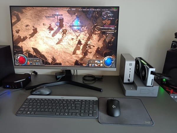 Un dernier mot sur un point particulier : les nuisances sonores de la carte graphique dédiée. Contrairement à une configuration de type "tour PC" classique, le GPU est ici exposé à l'air libre et posé sur le bureau, ce qui rend sa ventilation d'autant plus audible. Et dans notre cas, la carte graphique utilisée était sujette à un coil whine assez prononcé dès qu'elle montait en charge, dans les jeux par exemple. Le choix d'une carte graphique la plus silencieuse possible est donc encore plus important avec ce système de station d'accueil qu'avec une tour de PC fermée.