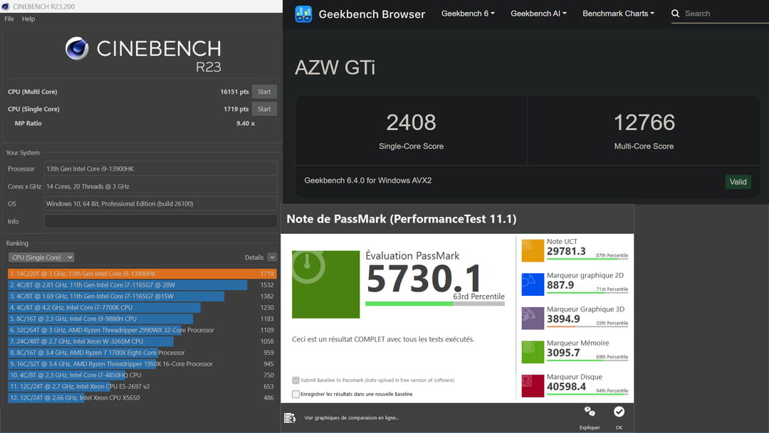 Les performances globales du mini PC seul sont dans la droite ligne de ce qu'on pouvait attendre de cette configuration, comme le montre les résultats des benchmarks synthétiques habituels. Sous PerformanceTest 11.1 de PassMark, le GTi13 Ultra obtient un score CPU de 29781 points, ce qui le place à peu près au même niveau qu'un AMD Ryzen 5 7600X ou qu'un Apple M2 Pro 12 Core. On retrouve des performances et un positionnement similaire sur Geekbench 6, avec un score single-core de 2408 points et multi-core de 12766, et sur Cinebench R23 avec un score single-core de 1719 points et multi-core de 16151 points.