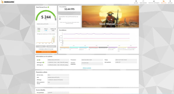 Lors de notre 3DMark le score de 5 244 sur le test Steel Nomad confirme le bon niveau global de la configuration, en cohérence avec ce que l'on attend d'un PC centré sur une RTX 5070.