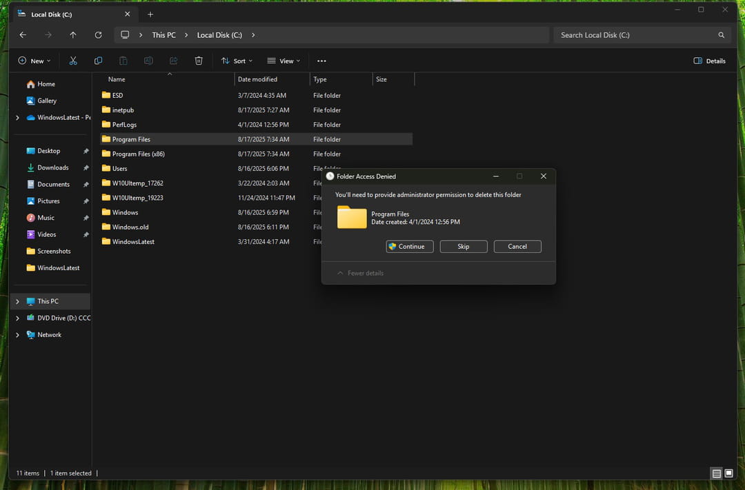 Autre correction très attendue : l'unification du mode sombre. Depuis son lancement, Microsoft vante l'esthétique modernisée de Windows 11 – coins arrondis, effets de transparence, palette apaisée – mais un détail gâchait tout : les vieilles fenêtres blanches héritées de Windows 7 et 10. Ces boîtes de dialogue surgissaient encore, même lorsque le mode sombre était activé, créant une rupture visuelle désagréable. Transfert de fichiers, suppression de dossier, autorisations administrateur… autant de fenêtres qui s'affichaient en clair, comme si elles n'avaient pas reçu le mémo du renouveau graphique.