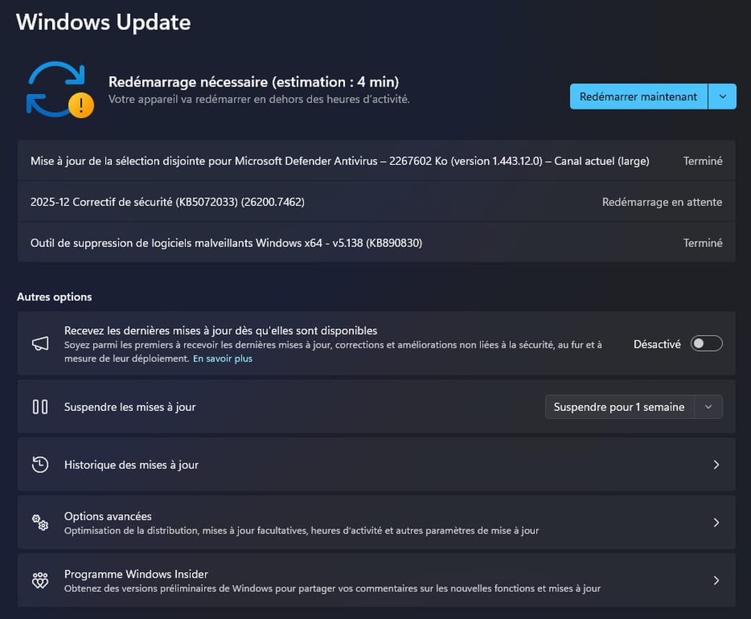 Comme toujours, la mise à jour vers la nouvelle version s'effectue avec Windows Update. Elle apparaît sous le sobre et lapidaire intitulé 2025-12 Correctif de sécurité (KB5072033) (26200.7462). Mais si elle est déjà disponible, nous vous conseillons, comme toujours d'attendre au moins quelques jours avant de l'installer.