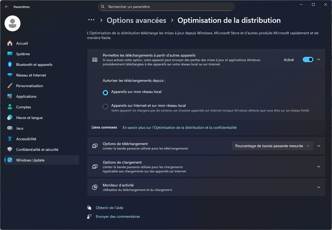 La bonne nouvelle, c'est que contrairement à Appxsvc, la distribution optimisée peut être désactivée sans risque pour le bon fonctionnement de Windows. Pour cela, il suffit d'ouvrir les paramètres de Windows, d'aller dans Windows Update, puis dans la section Options avancées. Il faut ensuite ouvrir la rubrique Optimisation de la distribution et cliquer sur l'interrupteur de l'option Permettre les téléchargements à partir d'autres appareils pour désactiver cette fonction de redistribution.