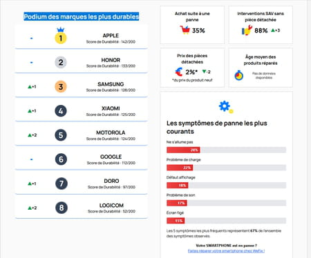 Après, le groupe épingle Samsung en particulier, mais il est probable que ce problème concerne également les smartphones pliables des autres constructeurs. Simplement, les volumes de vente des autres marques (Huawei, Honor, Motorola) restent insuffisants en France pour produire des analyses justes d'un point de vue statistique. Cela explique toutefois pourquoi Samsung n'est qu'à la troisième place du podium pour la durabilité des smartphones.