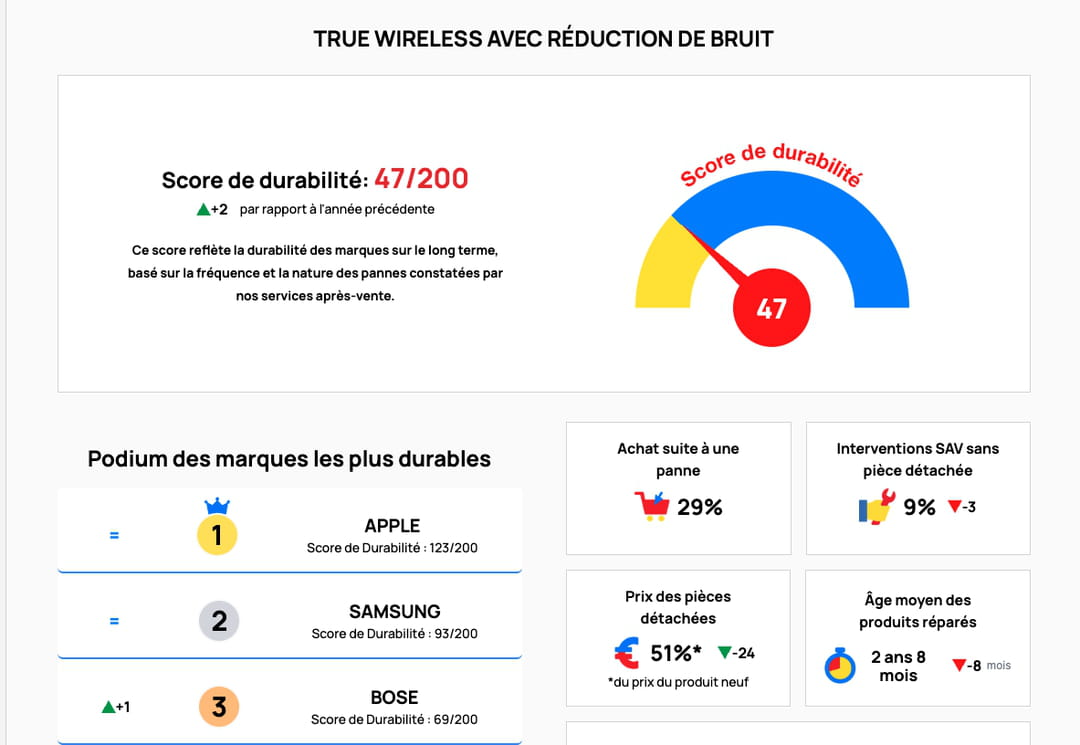 Les marques qui s'en tirent le mieux sont Apple, Samsung et Bose. Certaines catégories ont également de très mauvaises notes, comme les aspirateurs balai laveur et les aspirateurs robots, qui ont respectivement des scores de durabilité de 53 et 52 sur 200. Il y a donc pas mal de progrès à faire en la matière.