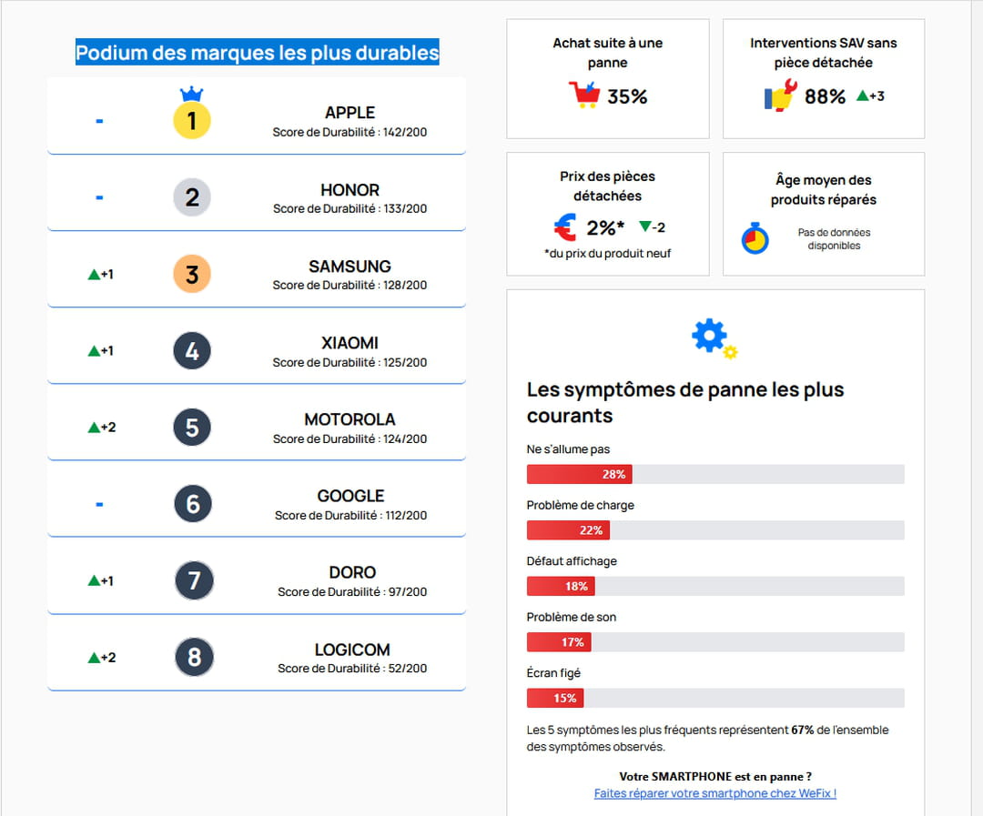 Apple est le parfait exemple des points morts des critères de durabilité du baromètre. En effet, l'entreprise arrive en tête du podium en ce qui concerne les smartphones. Pourtant, elle est régulièrement accusée de ne rien faire pour faciliter la réparation de ses appareils et de "tricher" dans ce type de note (voir notre article). Par exemple, les notes de l'entreprise américaine attribuées par iFixit en termes de réparabilité vont de 4 à 7 selon les références – et encore, la marque est sauvée par l'accessibilité de sa documentation, qui fait grimper les notes.