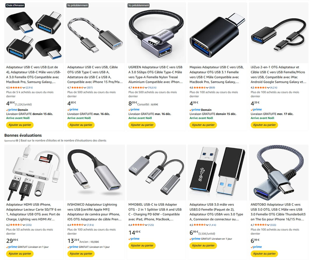 Si la plupart des adaptateurs OTG comportent une prise femelle de type USB-A – le format le plus répandu pour les clés et bon nombre d'appareils –, on en trouve aussi avec d'autres connecteurs : fente pour les cartes mémoire mémoire, port Ethernet pour le réseau filaire ou encore HDMI pour un écran externe. Il en existe même qui font office de hub, avec plusieurs prises différentes !