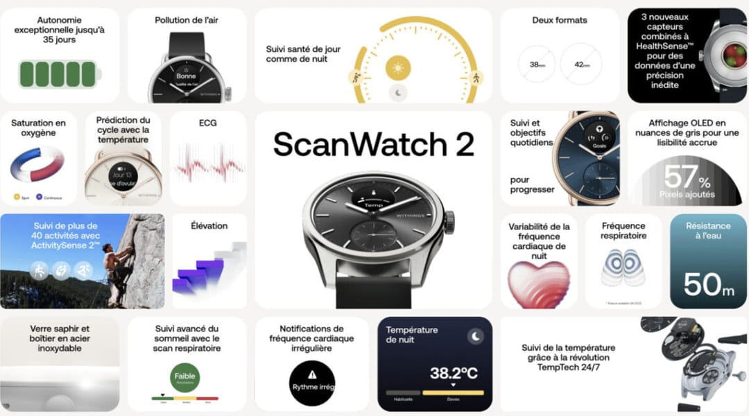 Ce vendredi 5 septembre, le salon IFA de Berlin a ouvert ses portes. L'occasion pour les acteurs de la tech de dévoiler leurs projets et leurs nouveaux produits. C'est notamment le cas de Withings, la marque française spécialisée dans les accessoires liés à la santé connectée, d'officialiser la sortie de la "nouvelle ScanWatch 2". Une annonce surprenante puisque la ScanWatch 2 existe déjà depuis deux ans. Pour rappel, il s'agit d'une montre hybride sortie en 2023 et qui est dotée de fonctions permettant d'analyser la fréquence cardiaque, la température de la peau, la qualité du sommeil, le taux d'oxygène sanguin ou encore un suivi d'activités physiques. Cette fois, Withings revient sur le devant de la scène avec un produit plus performant et moins énergivore, mais surtout capable de détecter des maladies.
