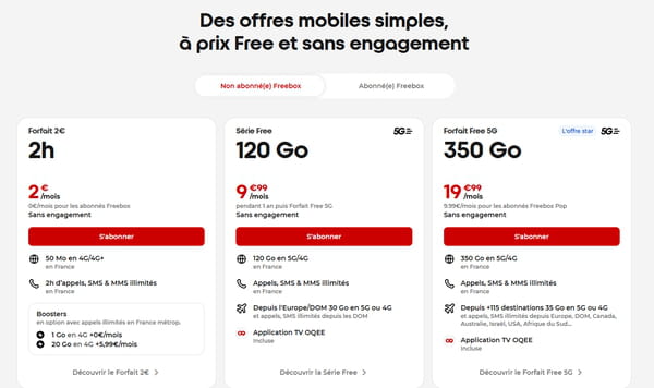 En activant par défaut cette technologie sur les appareils compatibles, Free Mobile devient le premier opérateur à faire basculer la majorité de ses clients vers la "vraie 5G". Car si elle désormais incluse en standard dans les "gros" forfaits (le Série Free en promotion permanente et le classique forfait illimité Free Mobile 5G), elle n'est pas proposée dans le "petit" forfait à 2 euros, pas même en option, ce qui est compréhensible.