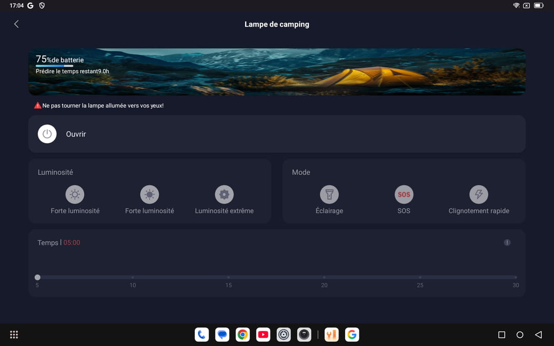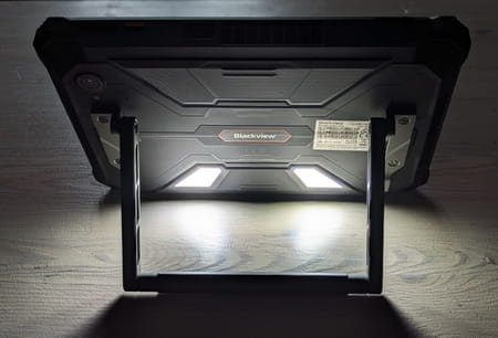 Pour en finir avec le chapitre lumineux, notons que les deux modules de Led situés à l'arrière de l'Active 12 Pro peuvent effectivement servir pour un éclairage mobile. Produisant une lumière blanche neutre, il s'avèrent assez puissants – Blackview annonce 400 lumens –, s'ajustent selon trois niveaux d'intensité en mode continu ou en mode clignotant, pour un SOS ou un stroboscope. Détail bienvenu : l'application associée dispose d'un réglage d'arrêt automatique paramétrable selon une durée. Pratique pour programmer une extinction des feux !