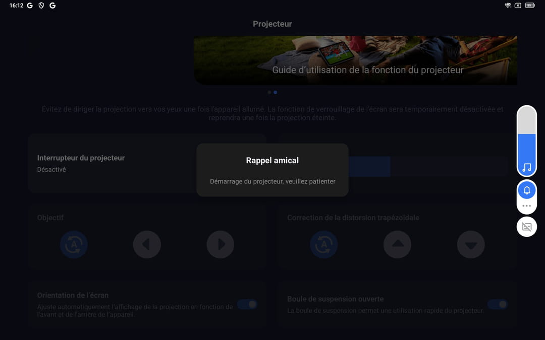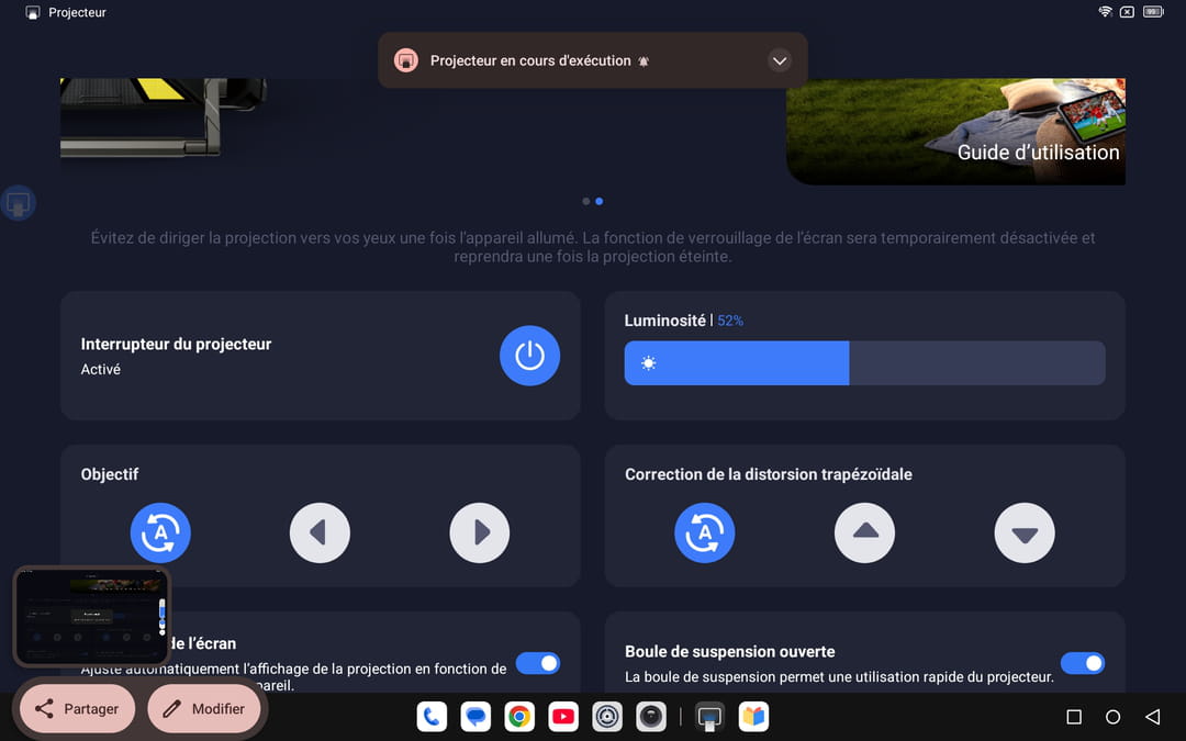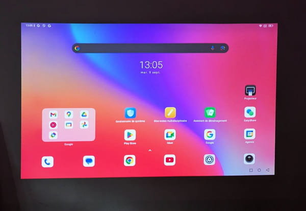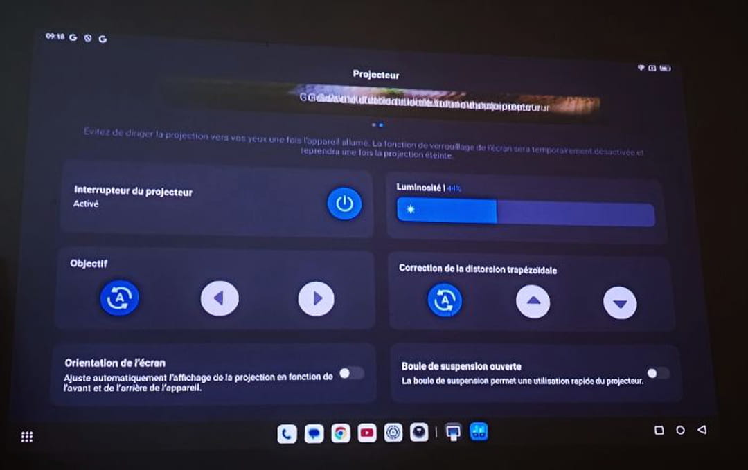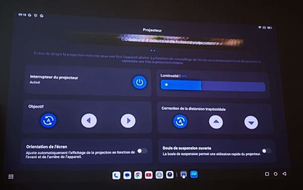 Surtout, à côté de quelques applis mystérieuses ou futiles comme Chambre froide ou SmartArt, on trouve Projecteur. Comme son nom le suggère, elle permet d'activer et de contrôler le vidéoprojecteur intégré. Et c'est clairement l'un des autres points forts de l'Active 12 Pro. Les réglages principaux sont simples : un bouton d'activation du projecteur et un curseur pour ajuster la luminosité.
