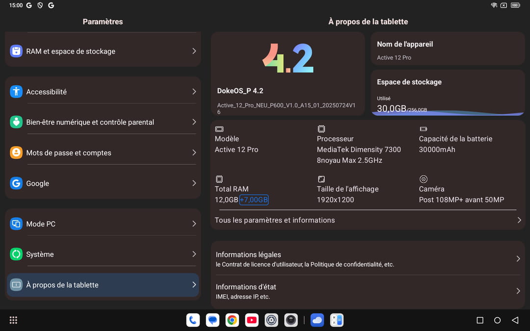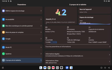 Sur le plan électronique, l'Active 12 Pro est plutôt bien lotie. Elle est en effet motorisée par un Dimensity 7300 (MT6878), un processeur tout-en-un MediaTek de milieu de gamme qui n'a pas grand chose à envier aux puces Snapdragon de Qualcomm équivalents. Ce SoC est en outre accompagné d'une mémoire vive de type LPDDR5 de 12 Go et d'un stockage en UFS3.1 de 256 Go en standard, ce qui est très confortable – une version en 16 Go - 1 To est également proposée. Une capacité de stockage qu'il est possible d'augmenter encore en installant une carte mémoire dans le tiroir prévu à cet effet – jusqu'à 2 To.