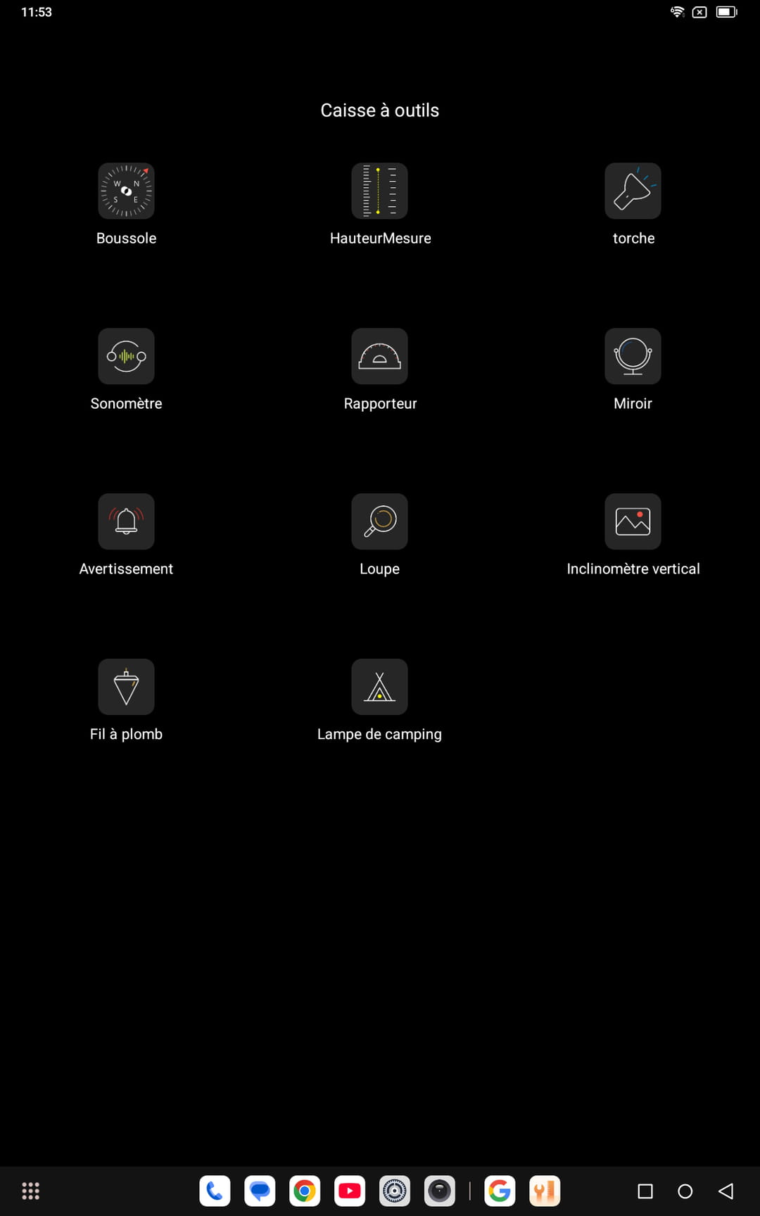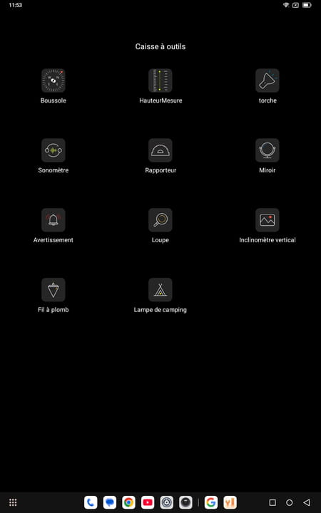 En plus des applications classiques, comme celles de Google (Play Store, Messages, Meet, YouTube, Photos, Maps, etc.) et d'utilitaires pour la gestion de fichiers ou la sécurité, Blackview a installé quelques logiciels comme la suite bureautique chinoise WPS Office, et quelques applis maison. En particulier Caisse à outils – sic ! –, qui regroupe plusieurs fonctions plus ou moins accessoires (Miroir, Torche, Boussole), mais aussi des modules ̂plus originaux principalement destinés aux bricoleurs : un fil à plomb, un rapporteur, des outils de mesure d'inclinaison et de taille ou encore une loupe qui exploitent astucieusement le zoom de l'appareil photo et même un sonomètre – rudimentaire mais très efficace. De façon amusante, mais agaçante, cette boîte à outils ne s'affiche qu'en mode portrait, alors que certains de ses modules mais pas tous, hélas – fonctionnent parfaitement en mode paysage. C'est ce genre de petit détail de finition qui montre que Blackview a encore un peu de travail sur le plan logiciel.