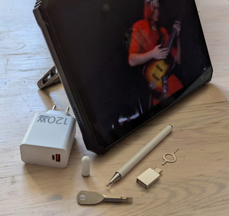La première – bonne – surprise survient au déballage. D'abord, parce que l'Active 12 Pro est accompagnée de plusieurs accessoires bienvenus : un solide pied métallique (en alliage d'aluminium) inclinable (de 0 à 180 degrés) à fixer avec des vis – le tournevis est même fourni ! –, un adapteur USB-C mâle en USB-A femelle pour brancher des périphériques, et un stylet spécial. Ensuite, parce qu'elle est également livrée avec un câble USB et un chargeur, ce qui est devenu extrêmement rare de nos jours. Et pas un gadget bas de gamme : il s'agit d'un modèle délivrant 120 W, avec deux prises USB, une en USB-A, l'autre en USB-C. Un accessoire bien pratique qui pourra servir à charger d'autres appareils, y compris des ordinateurs. Merci Blackview !