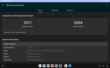 En termes de performances "pures", l'Active 12 Pro n'est évidement pas taillé pour la compétition avec son processeur moins puissant que les puces qui motorisent les tablettes très haut de gamme comme l'iPad Pro (Apple M4) ou la Galaxy Tab S10 Ultra (MediaTek Dimensity 9300+). Mais les scores du Dimensity 7300 aux benchmarks traditionnels sont plus que corrects : 711 915 points en global sur AnTuTu 10, 1071 points en monocœur et 3204 points en multicœurs pour le CPU et 2647 points pour le GPU avec Geekbench 6. Des résultats dans la moyenne, loin des ténors du marché, mais pas du tout ridicules.