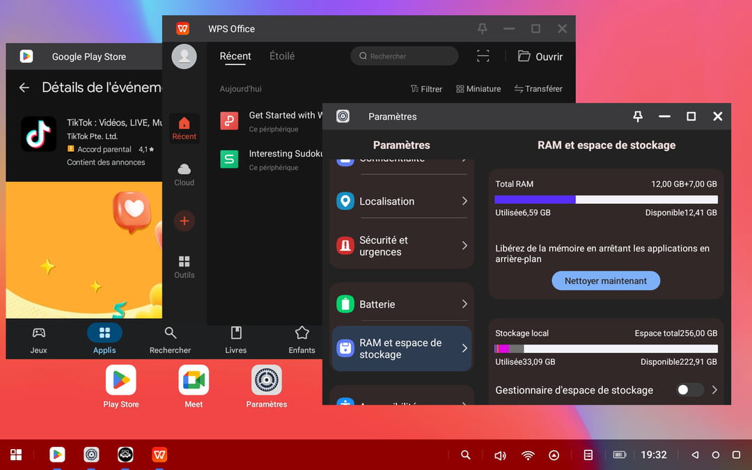 Surtout, en basculant en mode PC, l'interface change radicalement. Fini le mode Android classique, on bascule directement sur un bureau à la manière de Windows ou plutôt de Linux – car il s'agit effectivement d'une distribution personnalisée du système libre – avec une barre des tâches et des fenêtre indépendantes, déplaçables et redimensionnables, qui peuvent s'afficher en plein écran ou se réduire à volonté. De fait, malgré la taille modeste de l'écran – mais ce n'est pas pire que sur certains ultrabooks –, on se sent vite très à l'aise dans ce mode, surtout pour utiliser des applications bureautiques comme WPS Office ou pour rédiger des mails – l'intérêt est plus limité pour la navigation Web et les applis pensées pour un usage tactile. Et si ce mode ne transforme pas l'Active 12 Pro en véritable PC portable, il s'avère réellement bien pratique au quotidien, et pas seulement en dépannage. Un atout de plus pour cette tablette décidément pas comme les autres !