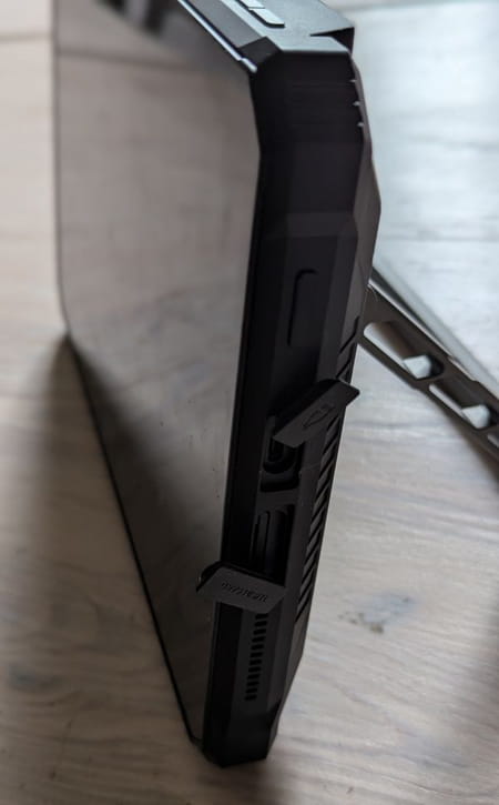 La deuxième surprise vient du design. À l'opposé des tablettes classiques de type iPad ou Galaxy Tab, qui misent sur la finesse et l'élégance, l'Active 12 Pro surprend par son côté massif et anguleux, et, surtout, par son épaisseur inhabituelle de près de 3 cm : elle mesure en effet 268 x 179 x 28 mm, sans son pied. Avec sa coque noire renforcée qui semble indestructible, elle semble tout droit sortie d'un film de SF guerrier, prête à affronter les pires combats – d'où cet aspect tank vraiment impressionnant.