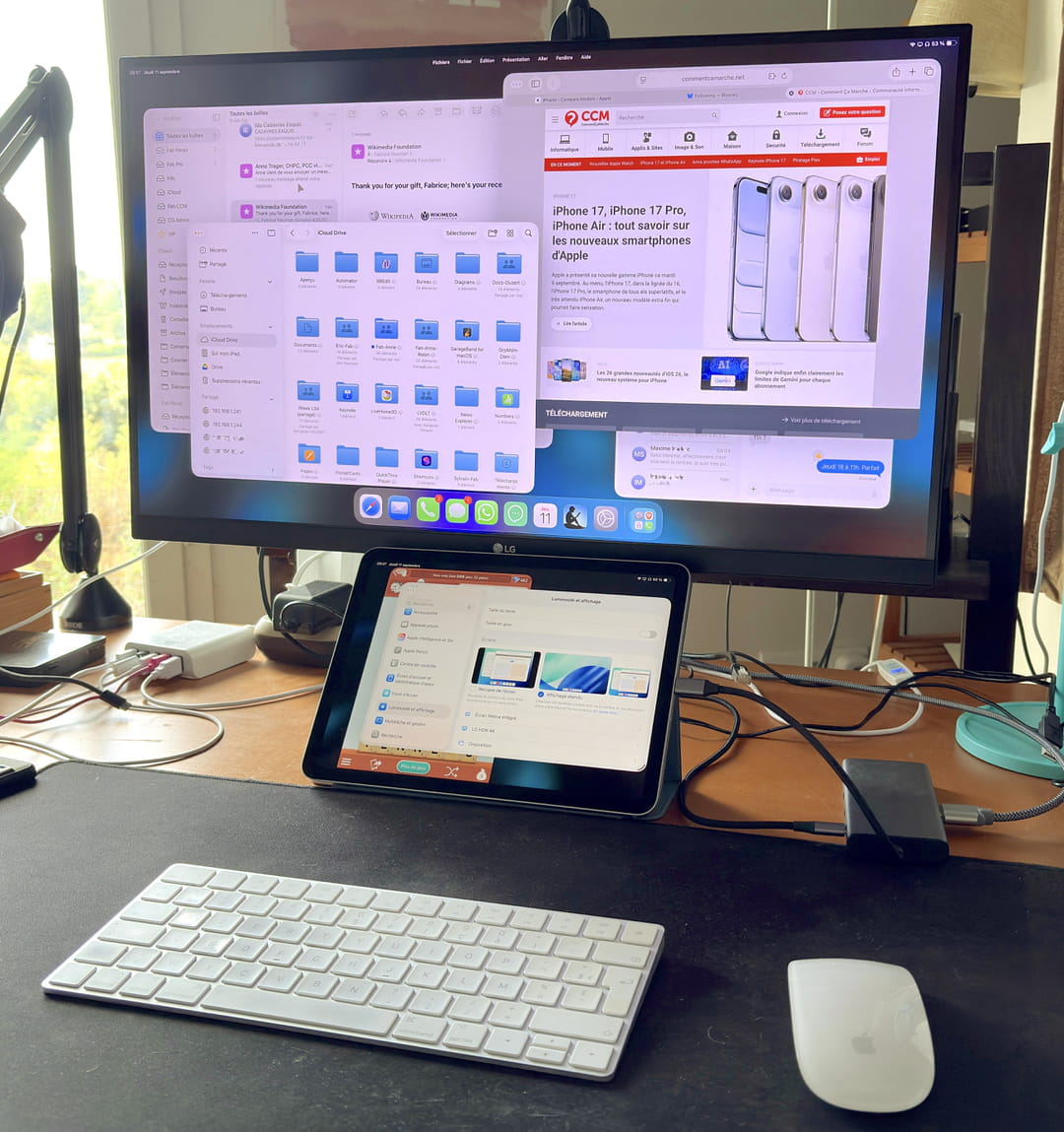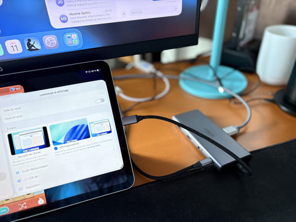 Parlons confort, justement. Le mode multi-fenêtres d'iPadOS 26 est vraiment pratique, mais on peut rapidement se sentir à l'étroit sur l'écran d'un iPad mini, forcément, et même sur un iPad muni d'un écran de 11 pouces. On sera en revanche un peu plus à l'aise sur les grands iPad Air ou iPad Pro munis d'un écran de 13 pouces de diagonale, comme un MacBook Air par exemple. Mais il y a un autre moyen pour être encore plus à son aise : brancher l'iPad sur un écran externe, comme ici sur un écran de 27 pouces !