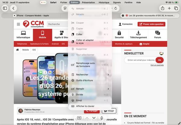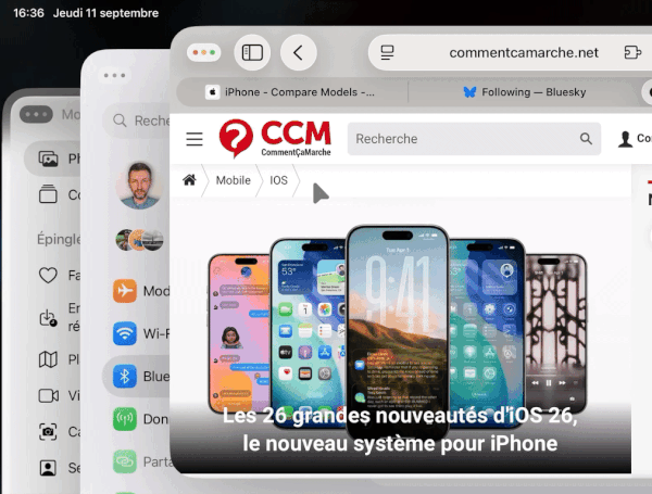 Aussi importante soit-elle, la fonction de multi-fenêtrage n'est pas la seule nouveauté d'iPadOS 26. Apple a en effet l'habitude de faire évoluer tous ses systèmes en parallèle. La nouvelle version du système des iPad adopte donc Liquid Glass, l'interface graphique toute en jeu de transparence et en effets d'animation que celle d'iOS 26. Avec donc aussi la même élégance et les mêmes problèmes ponctuels de lisibilité. Et au-delà de l'interface, toutes les nouvelles fonctions d'iOS 26 se retrouvent aussi dans iPadOS 26 : la nouvelle application Appareil photo simplifiée, l'appli Photos réorganisée, la personnalisation et les sondages dans l'application Messages, la traduction en direct, la nouvelle application Aperçu, l'historique dans l'application Mots de passe, etc. Retrouvez tous les détails dans notre article Les 26 grandes nouveautés d'iOS 26, le nouveau système pour iPhone.