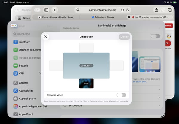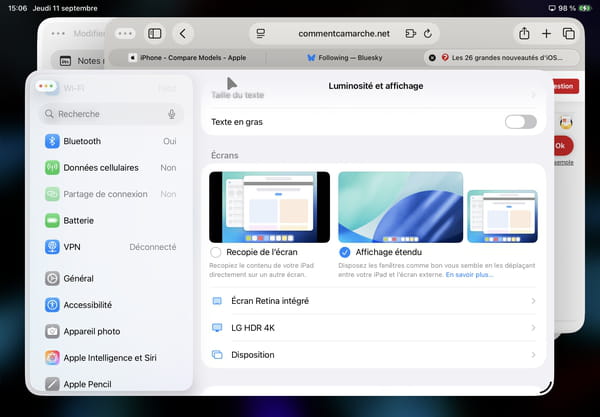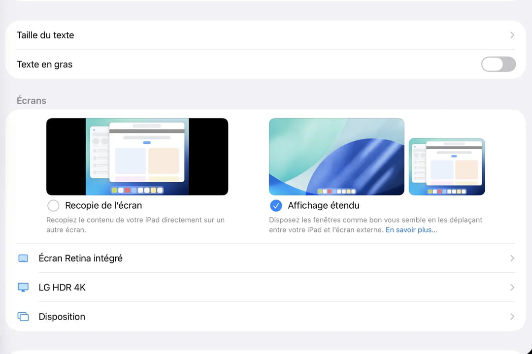 D'autant plus qu'iPadOS 26 pousse le raffinement jusqu'à pouvoir utiliser l'écran externe comme miroir de l'écran de l'iPad ou, mieux, comme écran étendu. Résultat, on se retrouve aux commandes d'une machine à double écran, dont l'un d'eux reste tactile. Ce qu'aucun Mac n'a encore jamais proposé ! Pour choisir le mode qui vous convient, il vous suffit de vous rendre dans les Réglages de l'iPad, puis dans la section Luminosité et affichage. Vous verrez qu'une nouvelle option apparaît lorsqu'un écran externe est branché à la tablette. À vous de choisir : Recopie de l'écran ou Affichage étendu.