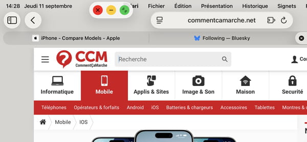 Si vous êtes un habitué du Mac, vous avez peut-être aussi remarqué un autre détail : les petits boutons à trois couleurs rouge, jaune et vert, juste à gauche du nom de l'application dans la barre de menus. D'une simple tap, vous l'agrandissez pour faire apparaître les mêmes boutons que le Mac pour gérer la fenêtre : rouge pour fermer, jaune pour masquer dans le Dock et vert pour réduire la taille de la fenêtre. Nous y voilà : d'une tape sur le bouton vert, Safari est maintenant dans une fenêtre flottante.