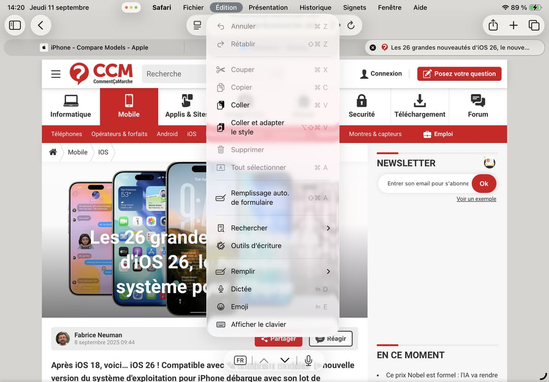 Et comme sur un Mac également, les menus proposés dépendront de l'application que vous êtes en train d'utiliser. Ici, dans Safari, on voit par exemple les traditionnels menus Fichier et Édition mais aussi, un peu plus loin, les menus Historique et Signets. Une simple tape du bout du doigt et le menu se déroule. Vous pouvez y choisir la fonction qui vous intéresse. Pratique.
