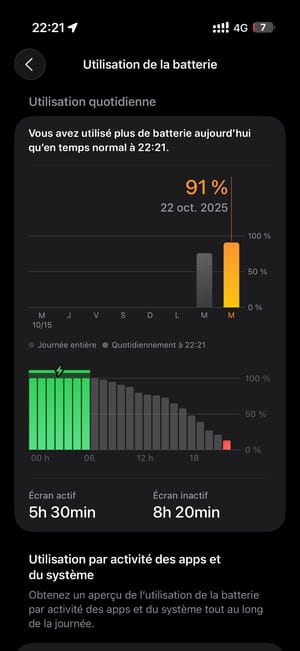 Avec sa batterie de 3149 mAh seulement, on aurait pu craindre que l'autonomie de l'iPhone Air soit catastrophique. À titre de comparaison, l'iPhone 17 dispose d'une batterie de 3692 mAh, tandis que celle de l'iPhone 17 pro atteint les 4252 mAh. Contre toute attente, il n'en est rien. L'iPhone ne tiendra évidemment jamais deux jours de suite, mais lors de notre test, l'iPhone Air s'est tout simplement comporté exactement comme l'iPhone 16, tenant facilement la journée en utilisation modérée. La capture d'écran ci-dessous montre une de ses journées "normale" : débrancher de son chargeur à 6 h 30 du matin, il restait 7 % de batterie à 22 h 20 avec un temps d'écran allumé de 5 heures 30. De quoi être rassuré finalement.