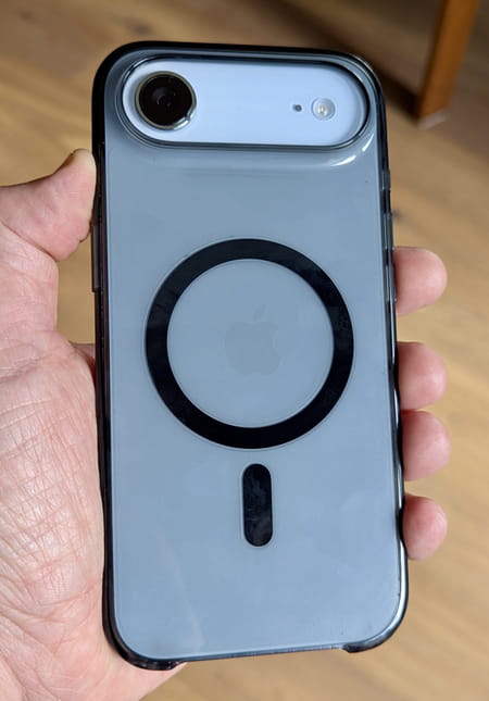 Autant dire que cela donne envie d'utiliser l'iPhone Air, sans coque, sans étui, sans aucune protection supplémentaire, puisqu'il est si solide. Ce qui permet de vraiment profiter de son extrême finesse au quotidien. Et c'est vrai que dès que l'on insère l'iPhone Air dans un étui aussi fin, soit-il comme la coque transparente d'Apple (voir photo), on perd une grande partie de l'intérêt de la finesse de l'iPhone Air. Bien sûr, un iPhone Air dans une coque reste toujours plus fin qu'un iPhone "tout court" placé dans une coque également.
