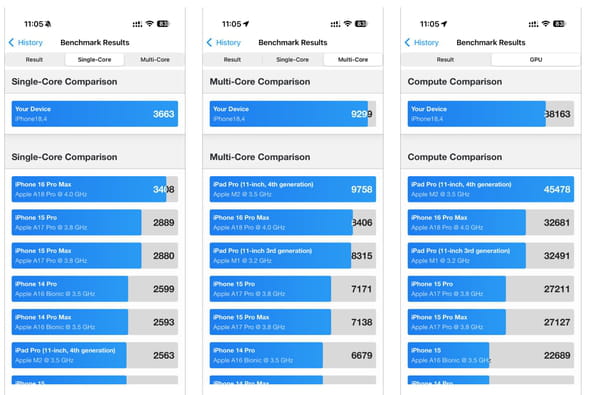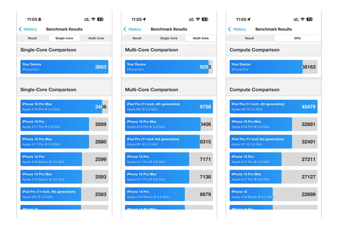 L'iPhone Air ne fait pas non plus de compromis côté puissance. Il intègre le même processeur A19 Pro que les iPhone 17 Pro et Pro Max, faisant uniquement le sacrifice d'un cœur graphique (GPU). Autant dire que c'est une bête de course. Les tests synthétiques comme Geekbench le montrent : l'iPhone Air est plus rapide que l'iPhone 16 Pro de l'année précédente. Autant dire qu'on ne manquera jamais de puissance sur un iPhone Air, y compris pour jouer aux jeux les plus exigeants.