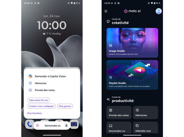 Côté système, le Edge 70 est animé par Android 16 (la dernière version en date) et la surcouche logicielle maison MyUX. Fluide et réactive, l’interface se rapproche de la proposition native d’Android. L’IA est bien évidemment à bord de l’appareil. La tranche gauche du Edge 70 accueille d’ailleurs un bouton qui, après une pression longue, permet de lancer plusieurs actions avec Copilot Vision (Gemini est également présent bien entendu) de prendre des notes, de créer des fonds d’écran, de débriefer les notifications, etc.