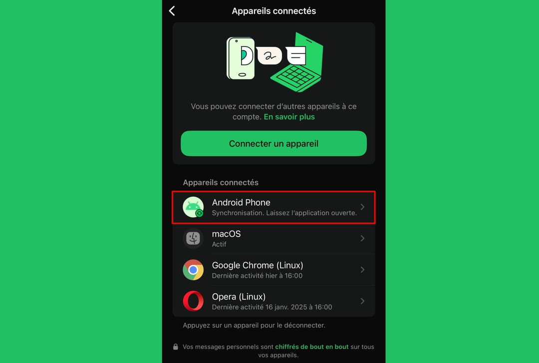 Mais, surtout, si vous recevez ce fameux code de vérification sans l'avoir demandé, vous devez immédiatement vérifier les appareils connectés à votre compte. Le procédure est simple. Ouvrez l'application WhatsApp sur votre smartphone, allez dans le menu (les trois points), puis dans la section Appareils connectés pour afficher la liste de tous les appareils reliés à votre compte. Si un appareil vous est inconnu, sélectionnez-le et déconnectez-le immédiatement !