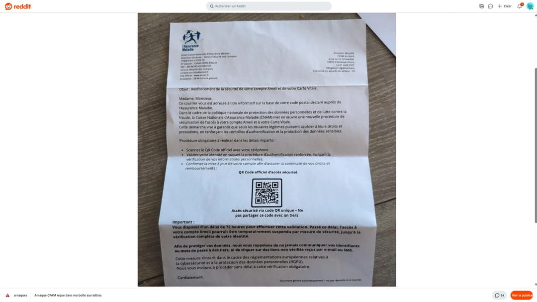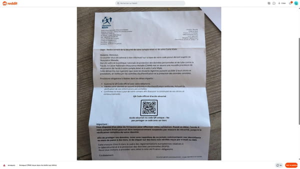 Il serait naïf de croire que cette arnaque ne sévit qu'en Outre-Atlantique. Ce week-end, un internaute a lancé une alerte sur Reddit après avoir reçu un courrier en provenance soi-disant de l'Assurance maladie et exigeant une validation urgente de son identité via un QR code. La lettre est extrêmement convaincante : elle affiche le logo de l'Assurance maladie, a recours à des numéros de dossiers fictifs, et se permet même plusieurs mentions du "service sécurité des comptes". Il s'agit là d'une "nouvelle procédure de sécurisation" qui, si elle n'est pas effectuée dans les 72 heures, entraînera la suspension temporaire du compte Ameli et le blocage des remboursements. Cela ne rigole pas ! Cerise sur le gâteau : le courrier rappelle qu'il ne faut "jamais communiquer vos identifiants ou mots de passe à des tiers", ni "cliquer sur des liens non vérifiés reçus par e-mail ou SMS".
