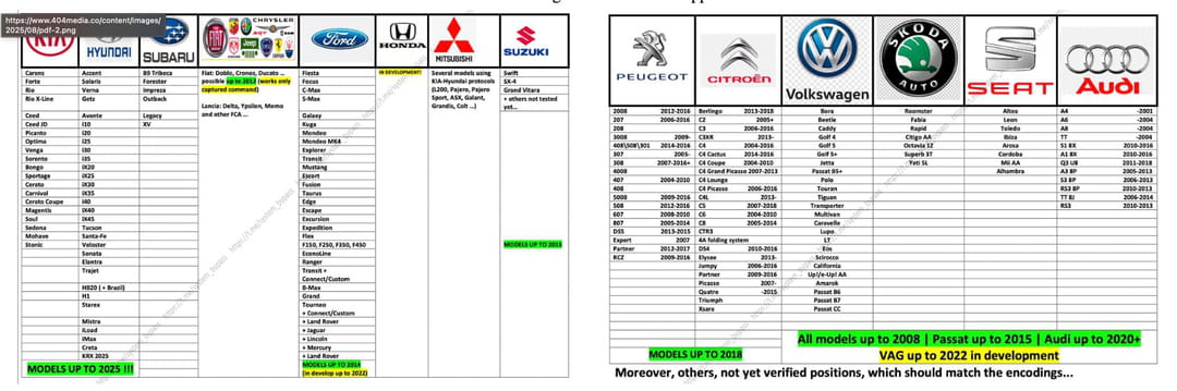 Le média 404 Media a révélé l'existence d'un marché noir où se vendent des firmwares modifiés pour le Flipper Zero. Deux développeurs russes sont parvenus à créer un business lucratif autour du piratage automobile. Les programmes qu'ils ont conçus permettent d'intercepter et de cloner les signaux des clés de voitures. Après avoir intercepté le signal de clé légitime, le logiciel analyse la séquence et prédit mathématiquement les codes suivants. Plus besoin de casser la vitre ou de forcer la serrure pour entrer dans le véhicule, une simple pression suffit ! Près de 200 modèles sont concernés, dont des Ford, Audi, Volkswagen, Citroën, Subaru, Peugeot, Renault, Citroën, Fiat, Mitsubishi, Suzuki, Skoda, Hyundai ou encore Kia, si l'on en croit le document partagé par le hacker. Un module pour Honda serait également en préparation.