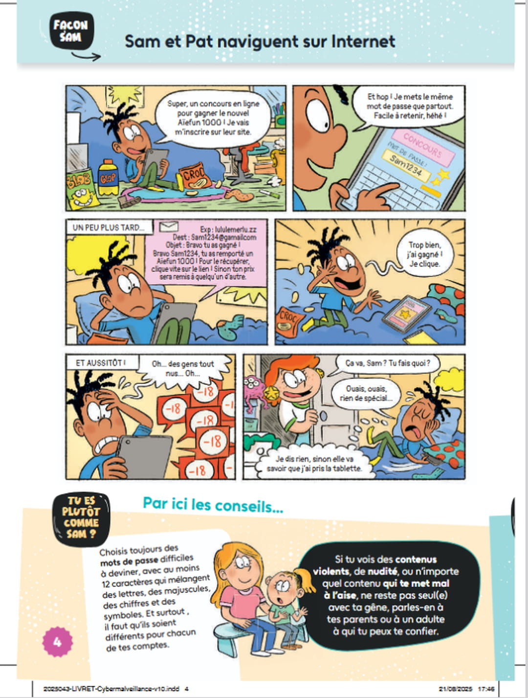 Le livret a été réalisé en collaboration avec Bayard Presse. Il adopte un format A5 et se compose de 12 pages qui abordent tous les pièges auxquels les jeunes utilisateurs peuvent être confrontés sur le Web. Mots de passe faibles, cyberharcèlement, hameçonnage/phishing, protection des informations personnelles... Chaque risque majeur est présenté par le biais de cas concrets et une touche d'humour afin de capter l'attention des 9-12 ans et leur permettre d'apprendre tout en se divertissant.