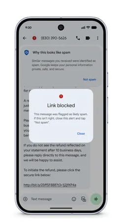 Dans un billet de blog, Google annonce deux nouvelles fonctions intégrées à Google Messages. La première permet de bloquer automatiquement les URL suspectes envoyées dans un message. En effet, les escrocs propagent souvent leurs arnaques par SMS, avec un message trompeur suivi d'un lien vers un site frauduleux destiné à recueillir les informations personnelles et bancaires de la victime. Renouvellement de la carte Vitale, colis qui ne rentre pas dans la boîte aux lettres, transaction bancaire frauduleuse... Tous les prétextes sont bons ! Aussi, à la place desdits liens, l'application affichera un pop-up indiquant que "ce message a été signalé comme un probable spam. Si ce n'est le cas, fermez cette alerte et appuyez sur "Pas un spam"." Ce n'est que lorsque cette dernière action est effectuée qu'il est alors possible de se rendre sur le site Web en question.