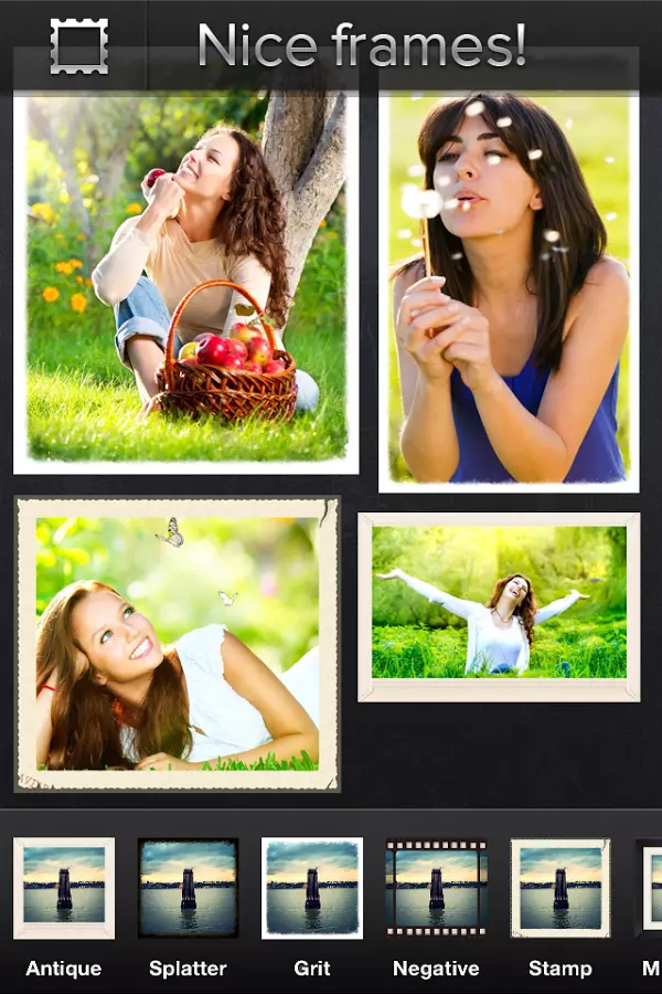 Ajout cadres : Cette fonctionnalité permet d'entourer les images avec des bordures spéciales. L'utilisateur aura un vaste choix de cadres, comme le style pellicule de film ou encore le style ancien. Il est aussi possible de décolorer les bords des photos.