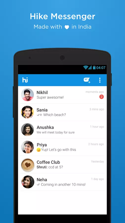 Message :hikemessenger offre la possibilité de communiquer par le biais de texto de manière individuelle ou en groupe. Chaque message peut être personnalisé à l'aide des différents thèmes proposés ou associés à des autocollants afin de les égayer. Partage : Cette application offre également la possibilité de diffuser des fichiers multimédias. Il est pour cela nécessaire de les importer à partir de l'unité de stockage du téléphone et les définir en tant que pièce jointe lors des discussions. Cryptage : Dans le but d'éviter que les messages ne soient interceptés par des personnes malveillantes, hikemessenger est capable de les chiffrer. Les textes cryptés ne seront alors lisibles qu'à l'adresse indiquée lors de l'envoi. Mode invisible : Avec cette application, l'utilisateur peut se cacher des autres personnes connectées et définir celles qui pourront le voir. Cette option peut être paramétrée dont chaque modification nécessite l'insertion d'un mot de passe.